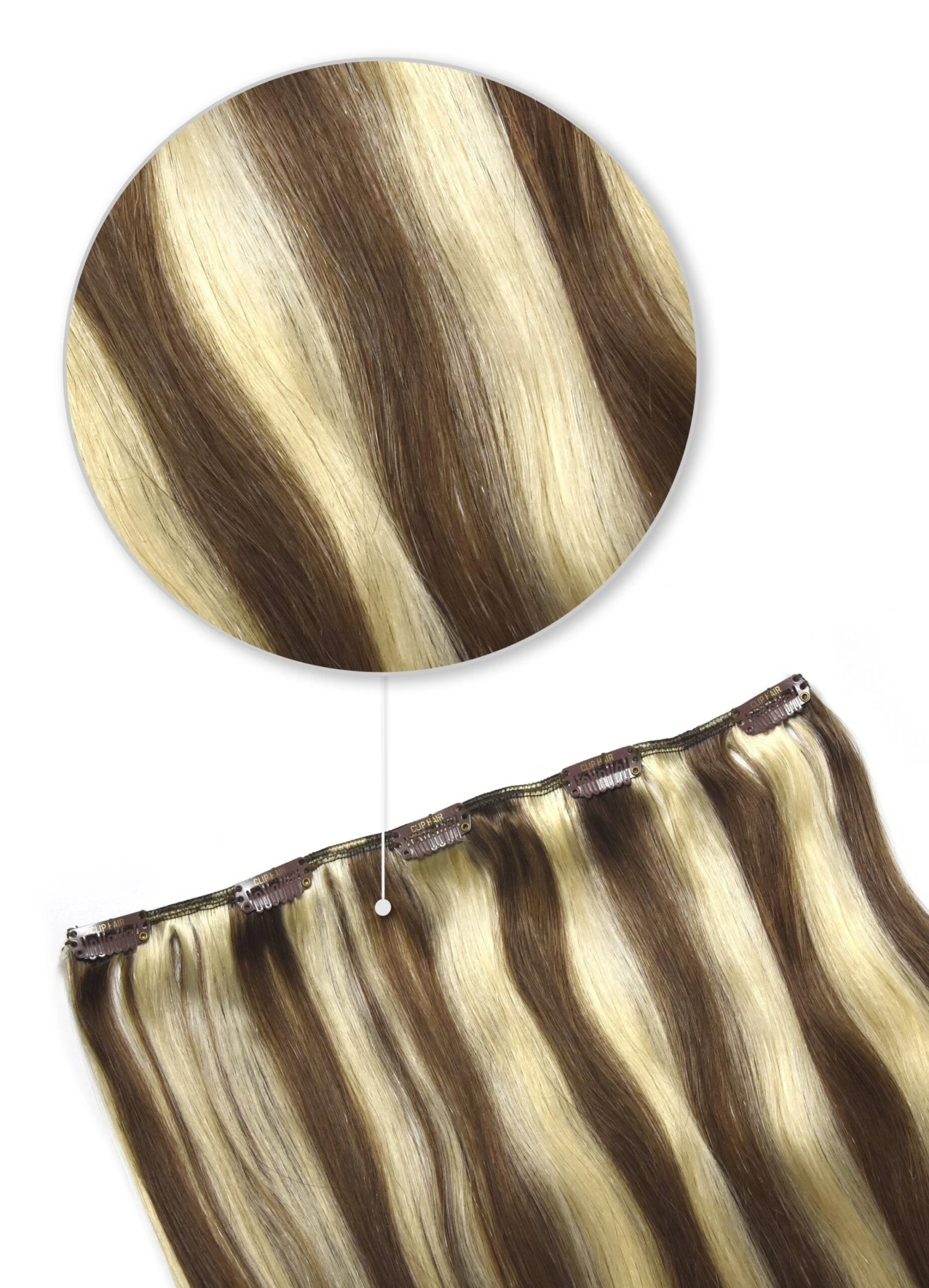 One piece clip in hair extension in Light Brown and Blonde Mix.