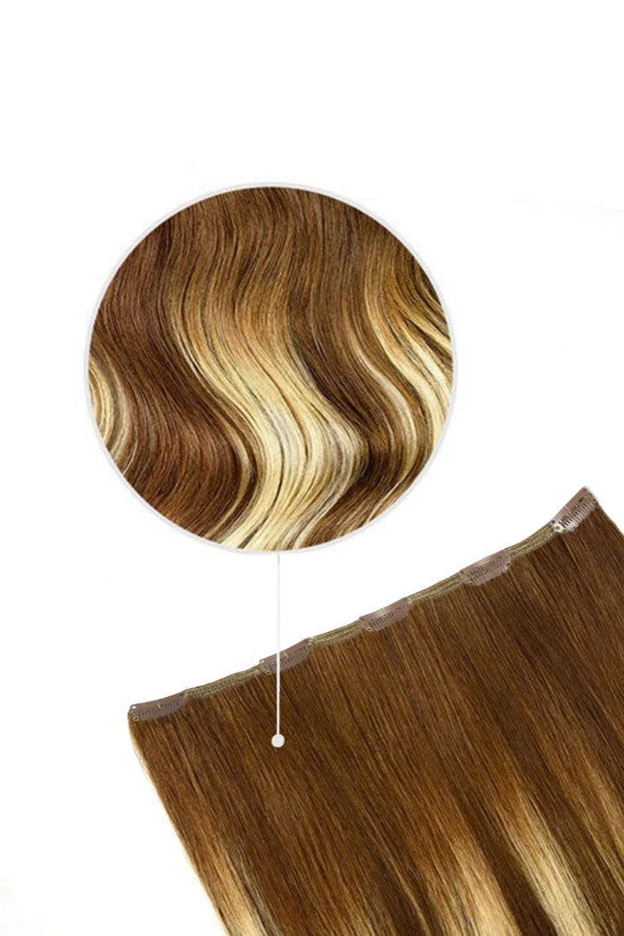 One piece clip in hair extension in Chestnut Bronde Balayage.