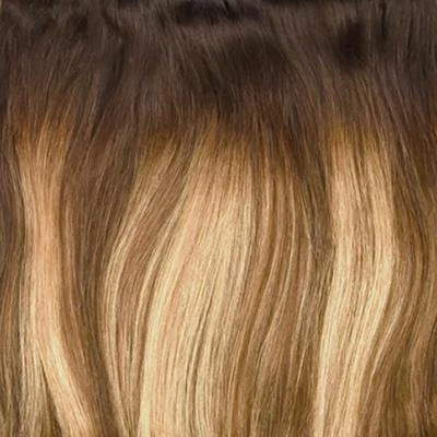 One piece clip in hair extension in Chestnut Honey Balayage.