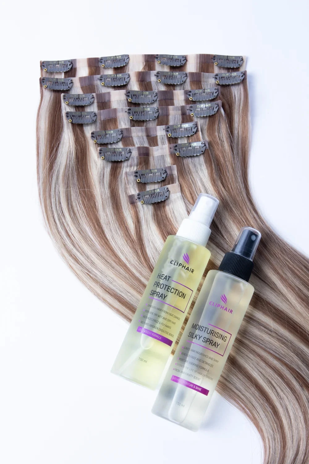 Crafted from 100% double-drawn Remy human hair, these gorgeous hair extensions are supercharged with the unmatched shine, softness, and manageability of AAAAA tresses. Coming with a duo of spray treatments (the Moisture Lock Shine Spray & Cliphairβs very own Heat Protectant Spray), the bundle guarantees flawless finish and longevity to your look.
