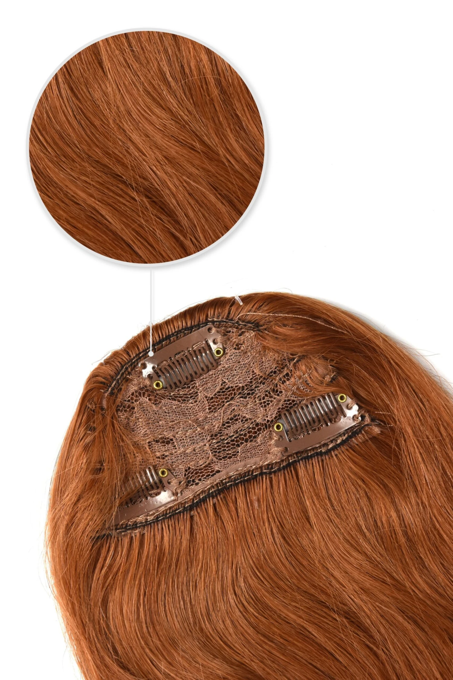 This Ginger Red/Natural Red (#350) clip in fringe hair set comes complete with 3 metal clips already attached to the weft complete with silicone tubing for a secure grip.
