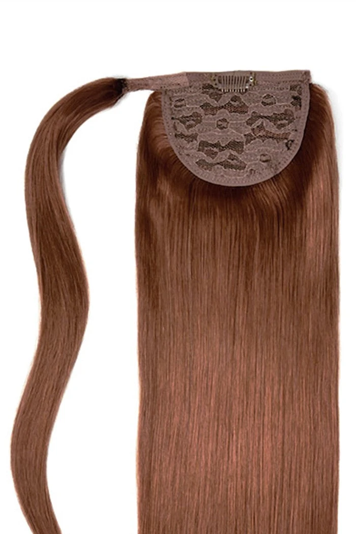 Remix your style with our vibrant silky Dark Auburn/Copper Red (#33) Straight Up Wrap Around Ponytail, made from real Remy human hair. Available in three lustrous lengths and endless styles at your fingertips, our new blonde ponytail extensions are sure to become a celebrity staple.