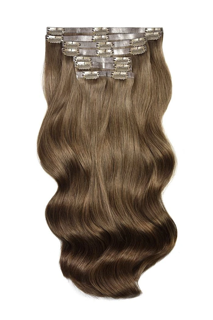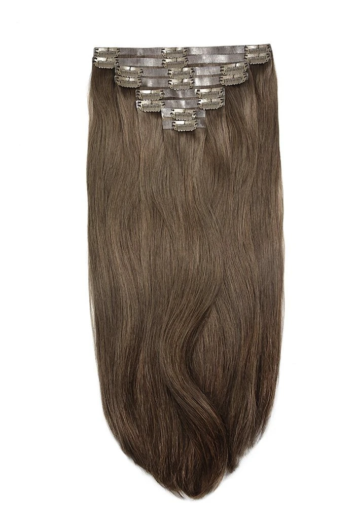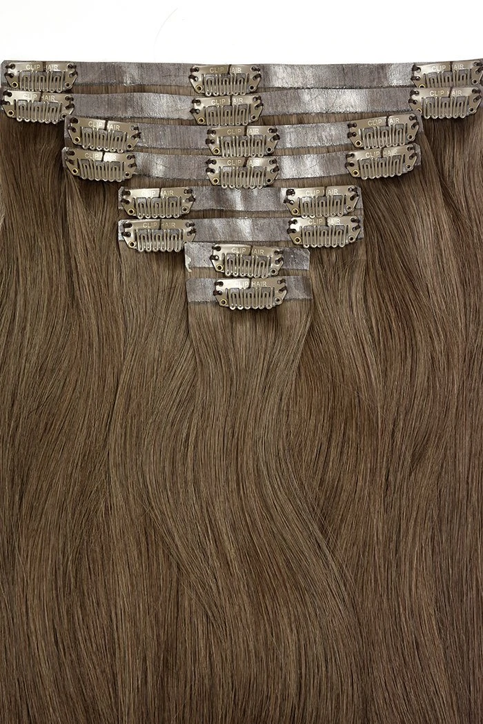 Our best selling Medium Ash Brown Seamless Clip In Hair Extensions are a full head set weighing 150g. The seam is soft and lays flat to the head, leaving your extensions almost undetectable. The seamless technology also protects the hair from shedding and tangling.
