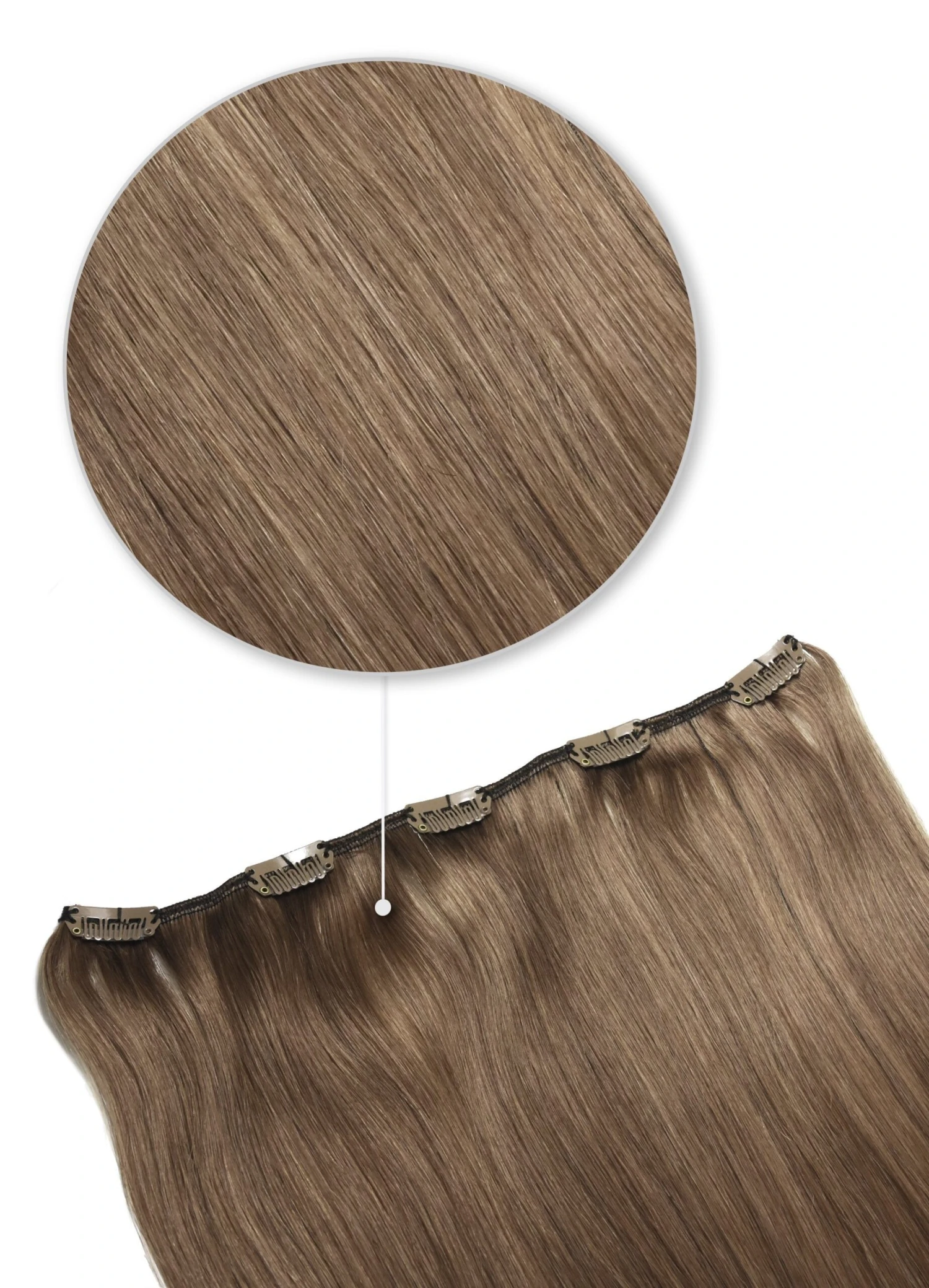 One piece clip in hair extension in Medium Ash Brown.