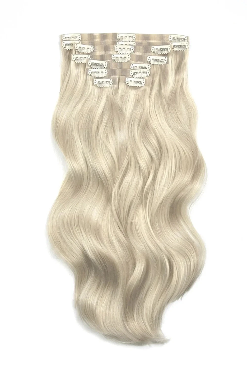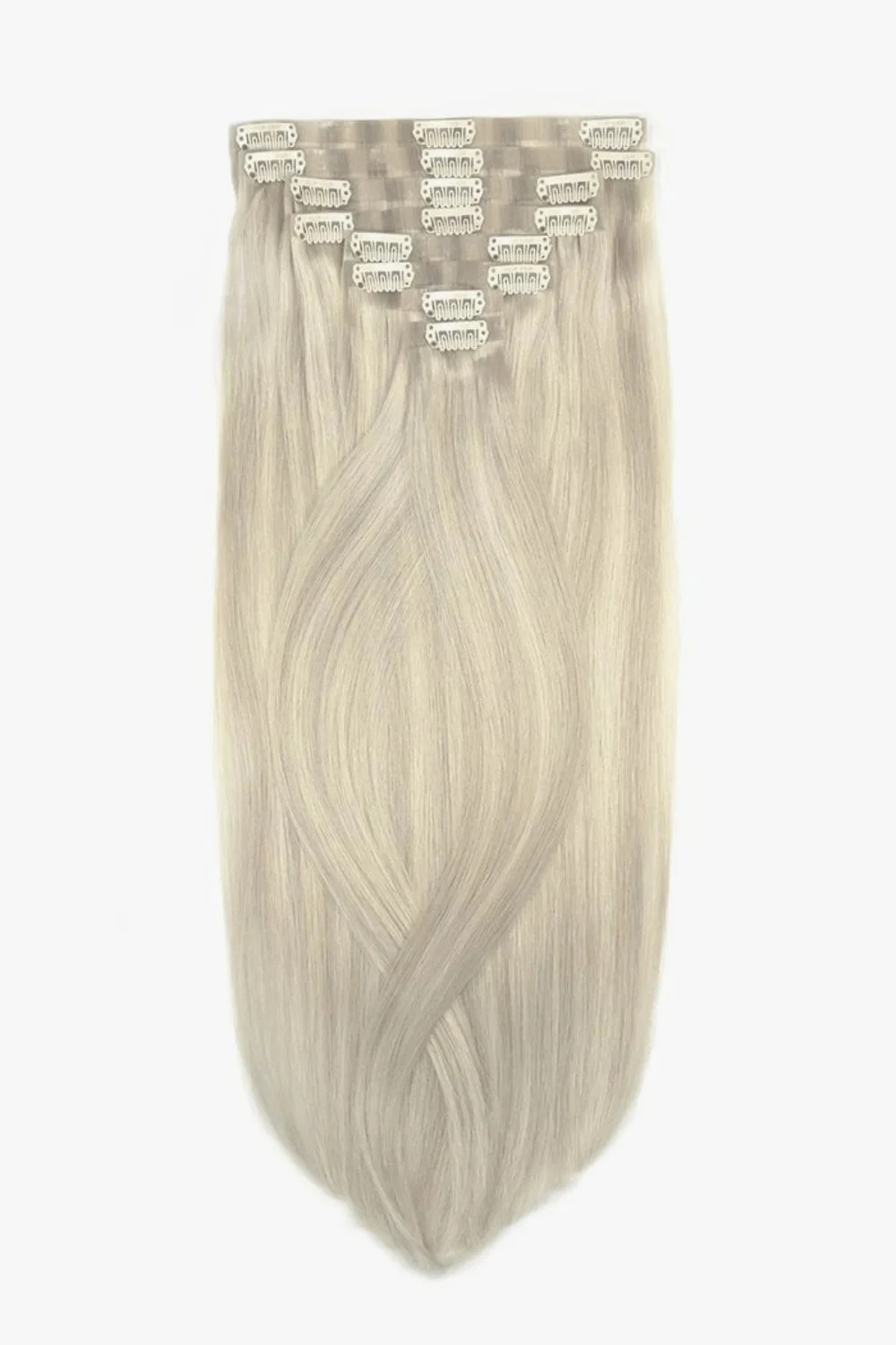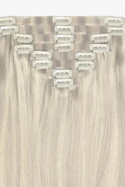 Our Platinum BlondeMe Double Drawn Seamless Clip In Hair Extensions are a full head set weighing 150g. The seam is soft and lays flat to the head, leaving your extensions almost undetectable. The seamless technology also protects the hair from shedding and tangling.