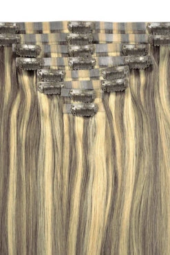 Our Dirty Blonde (#9/613) Double Drawn Seamless Clip In Hair Extensions are a full head set weighing 150g. The seam is soft and lays flat to the head, leaving your extensions almost undetectable. The seamless technology also protects the hair from shedding and tangling.